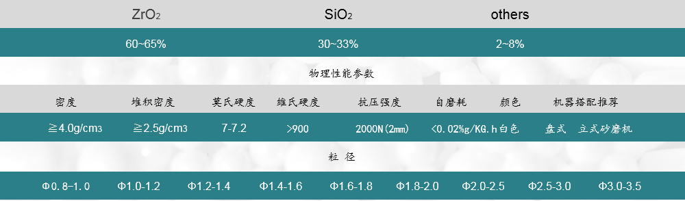 采用滾動成型工藝、通過高溫燒結(jié)制成,珠子內(nèi)部硅酸鋯微粒均勻致密,密度和硬度適中,適合中低黏度物料的研磨和分散,可匹配大部分市面上的砂磨機。